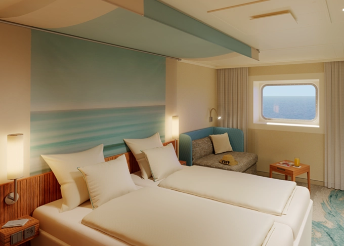 CA - Vonkajšia kajuta PREMIUM / obmedzený výhľad 14-16,5 m². Neotvárateľné okno / obmedzený výhľad. 6. paluba. Max 2 osoby. Cenový model Premium. 2 270 € 1 135 € za osobu