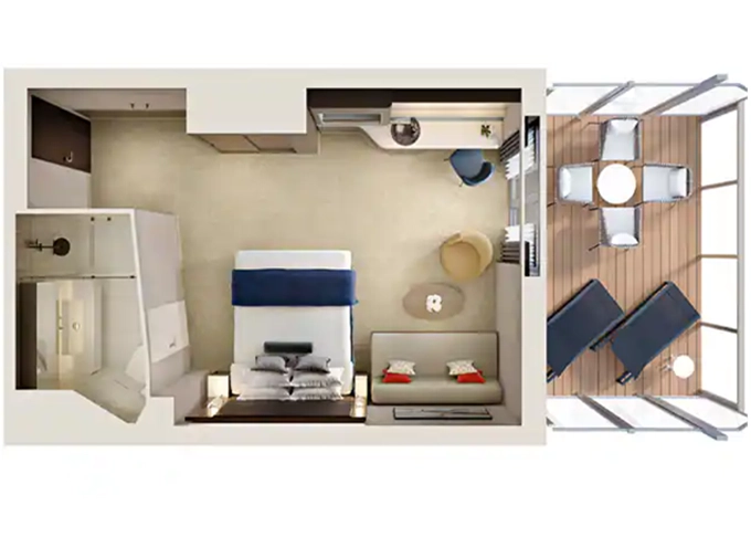 | B1 - Kajuta s veľkým balkónom Aft-facing 21 m² / balkón 8 m². 7. až 10. paluba - vzadu. Max 3 osoby. | 7 598 € 3 799 € za osobu | ||