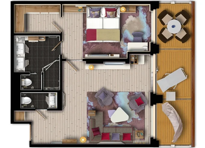| SUTO - Themen Suite 54 m² + balkón 15 m² so stolom, ležadlom a hojdacou sieťou. Spálňa, obývacia časť, šatník. 10. paluba. Max 4 osoby. Výhody Suite. | 22 796 € 5 699 € za osobu | ||